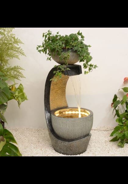 The  Bucket Fountain from Swiss Gallery The Fiber Hub is a charming and artistic water feature that adds a rustic yet modern touch to any space. With its flowing water design resembling cascading buckets, this fountain enhances relaxation and aesthetics, making it a perfect addition to gardens, patios, balconies, and interior decor.