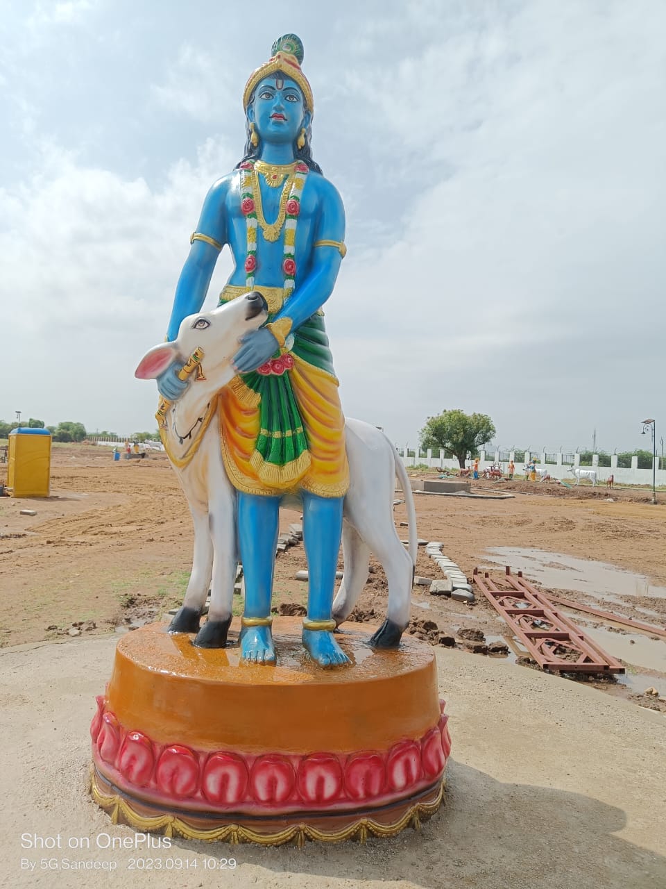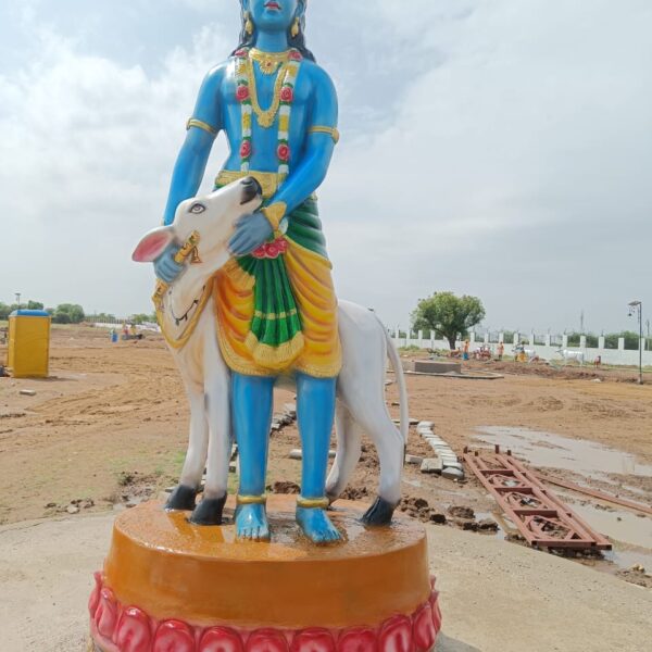 Krishna Statue made from FRP Fiberglass, designed by Swiss Gallery The Fiber Hub in India. It stands 6 feet tall and is suitable for both indoor and outdoor use. Featuring a customized, modern design, this statue is ideal for decoration and religious purposes.