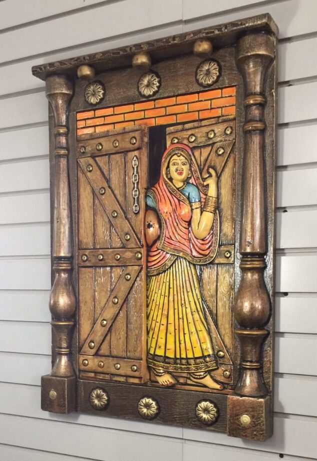 Lady Jharokha Mural crafted from FRP Fiberglass, ensuring durability, lightweight structure, and resistance to various environmental conditions. Designed by Swiss Gallery The Fiber Hub, this mural is suitable for both indoor and outdoor settings, making it a versatile and elegant decorative piece.