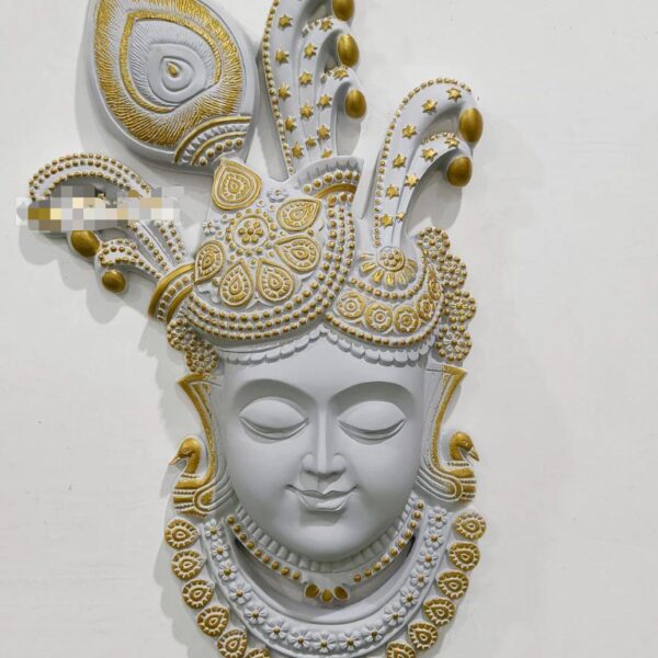 White Krishna Face Mural made from FRP Fiberglass, offering a durable, lightweight, and weather-resistant structure. Designed by Swiss Gallery The Fiber Hub, this mural is perfect for both indoor and outdoor applications, making it a versatile and elegant addition to any space.